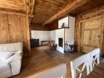 Das Wohnzimmer bietet einen bequemen Sitzbereich. Eine angenehme Atmosphäre wird durch einen Holzofen ergänzt.